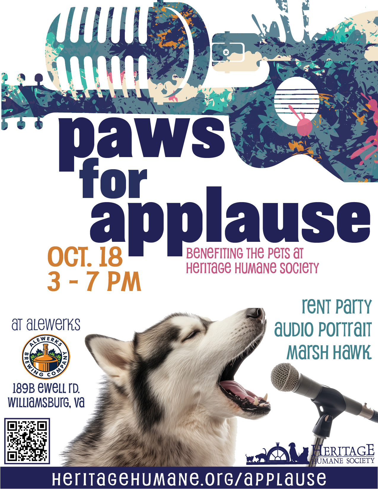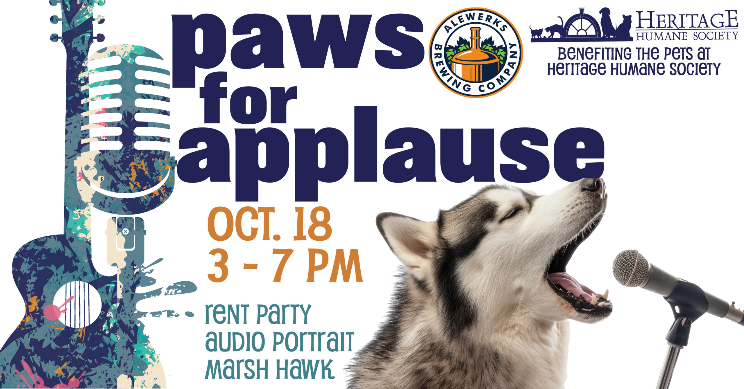 Get ready for a rockin’ GOOD TIME! Join us for a charity concert at Alewerks on Saturday, October 18. Three local bands will be performing live – Rent Party, Audio Portrait, and Marsh Hawk. The concert will benefit the homeless pets at Heritage Humane Society. The event will also feature raffles. And Alewerks is kindly donating a portion of the sales during the concert to The Heritage Humane Society.