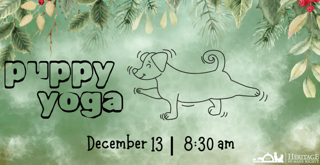 Join us in The Heritage Humane Society’s classroom on Saturday, December 13 at 8:30 a.m. for an hour-long beginner-friendly gentle yoga practice. It will be a donation-based yoga class to benefit the homeless pets at the shelter. This is a gentle yoga class accessible to yogis of all levels and beginner-friendly, modifications will be offered to meet the needs of all personal practices. Join us with your yoga mat and be ready to breathe, move, have fun, and meet some adorable, adoptable PUPPIES!