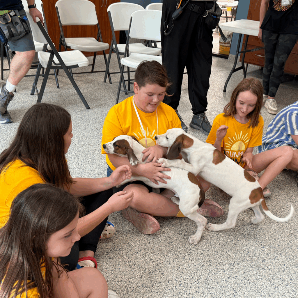 The next morning the children named them Buzz Lightyear, Andy, Mrs. Potato Head, Mr. Potato Head, Little Bo Peep and Forky. Soon the room was filled with tiny paws and children’s laughter. The campers gently showed the puppies toys and introduced soft touches and patience.