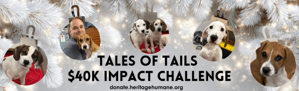 After GivingTuesday, several kind donors reached out with an offer that made all of us stop and feel a bit emotional. They created the Tales of Tails Impact Challenge for the end of the year to continue the needed momentum. Donations will be matched up to $40,000. If you choose to give, your gift will provide twice the safety and care. Your support can be given online at donate.heritagehumane.org or in person at the adoption center located at 430 Waller Mill Road, Williamsburg, VA 23185.