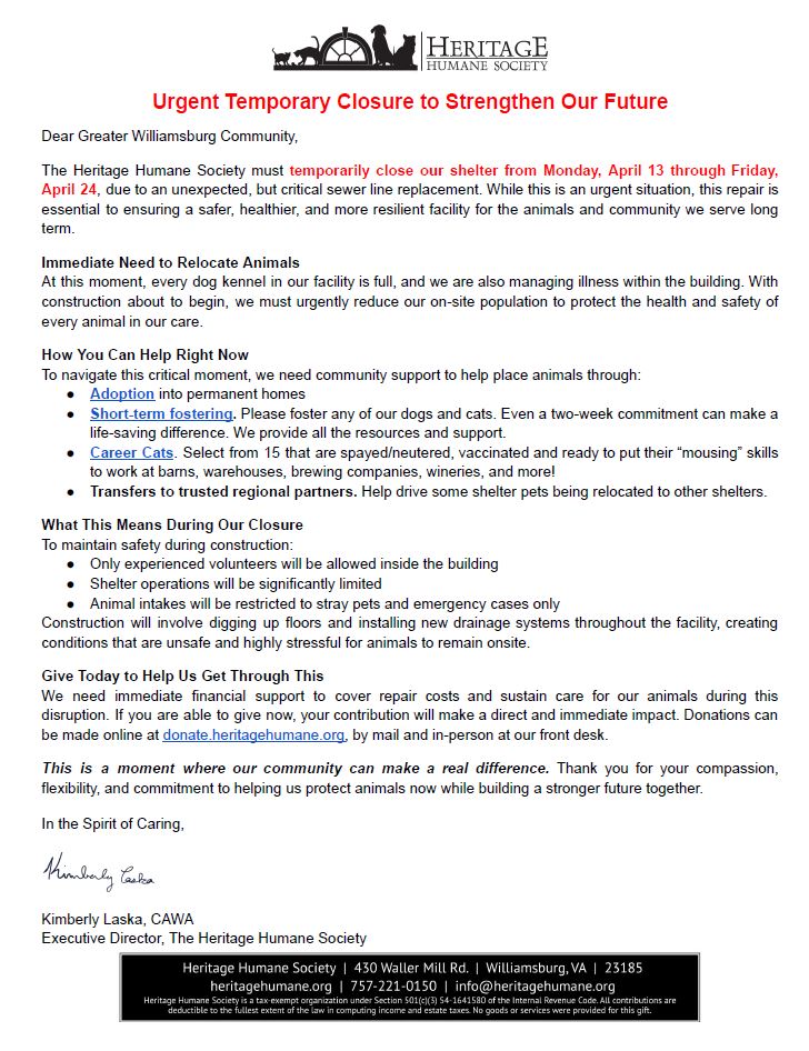 Please read the letter below from Kimberly Laska, CAWA, HHS Executive Director regarding the urgent need to temporarily close our shelter from Monday, April 13 – Friday, April 24, 2026: