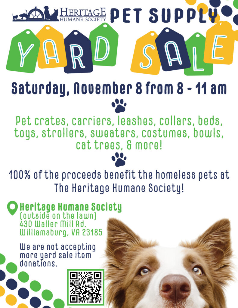 Join us for a special Pet Supply Yard Sale on Saturday, November 8 from 8 AM to 11 AM at The Heritage Humane Society!